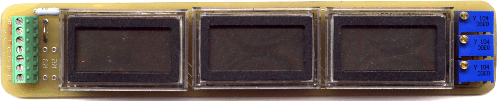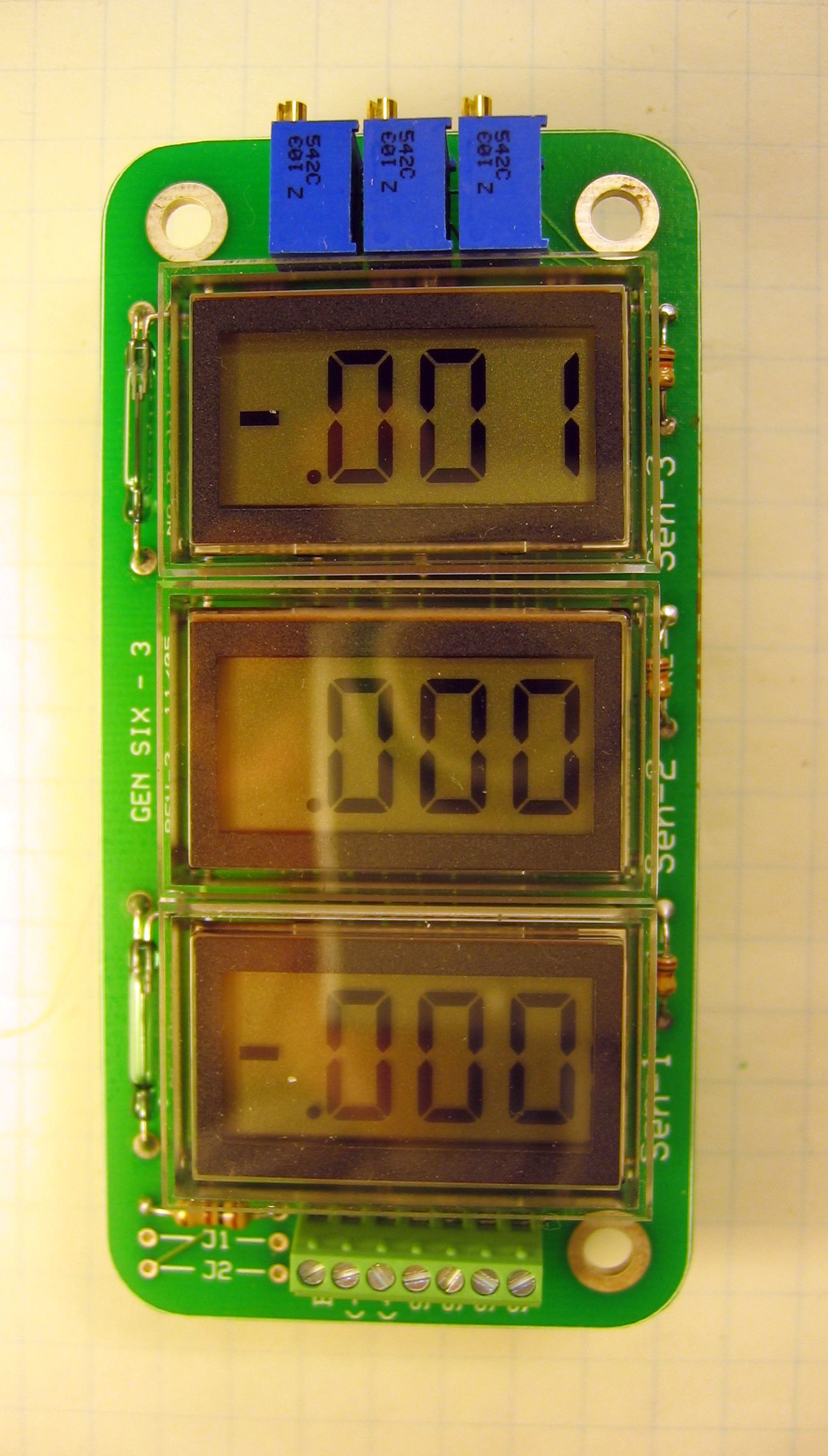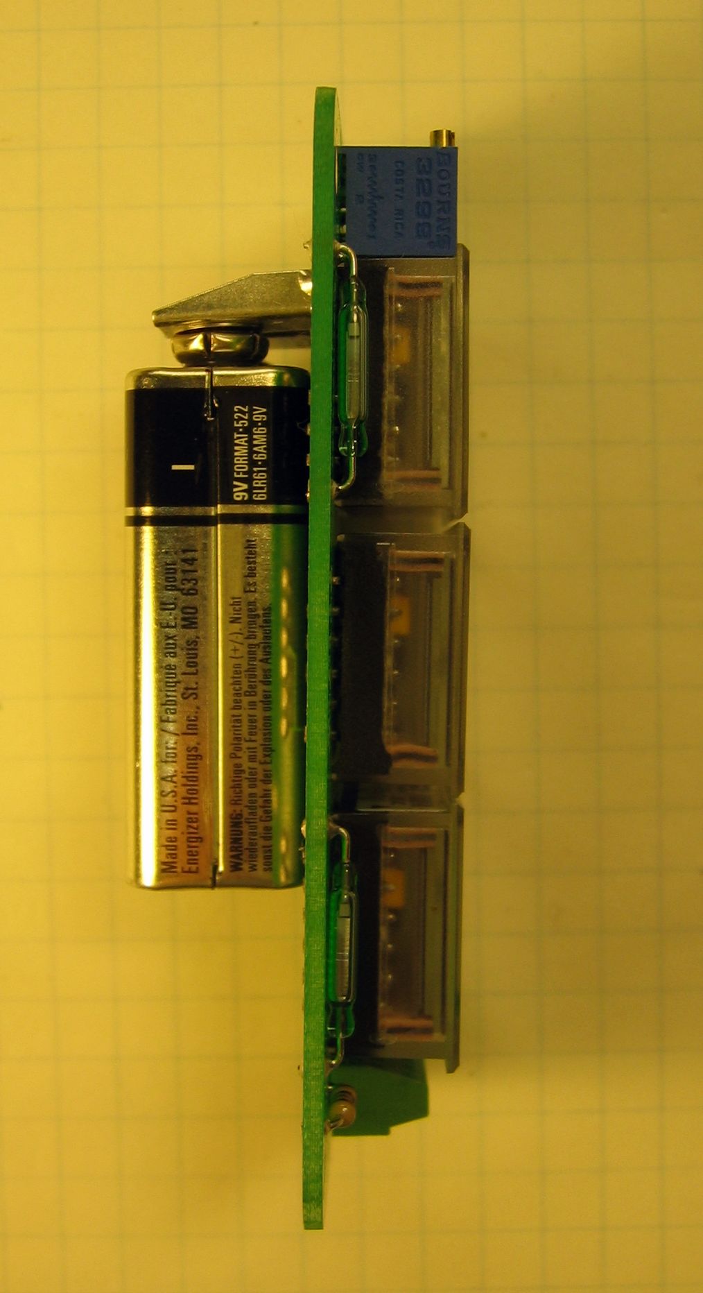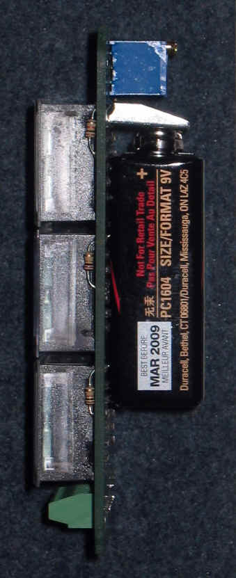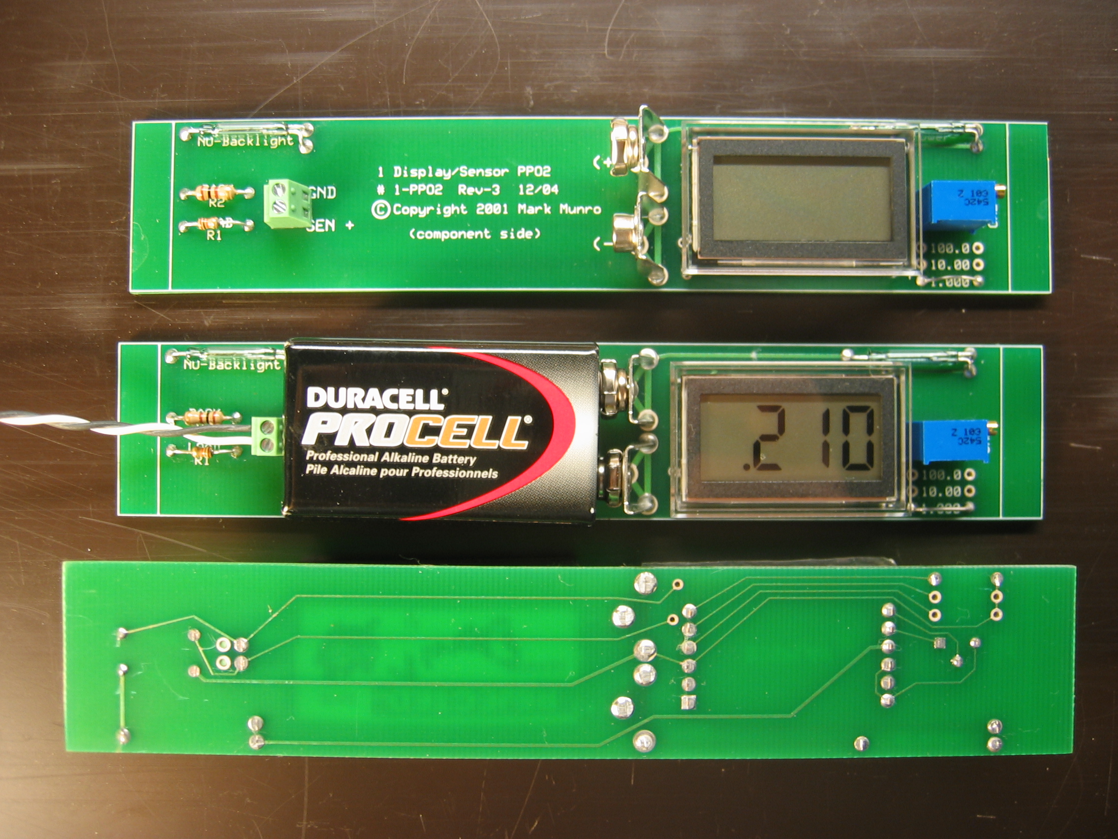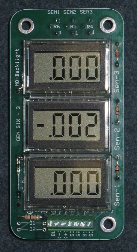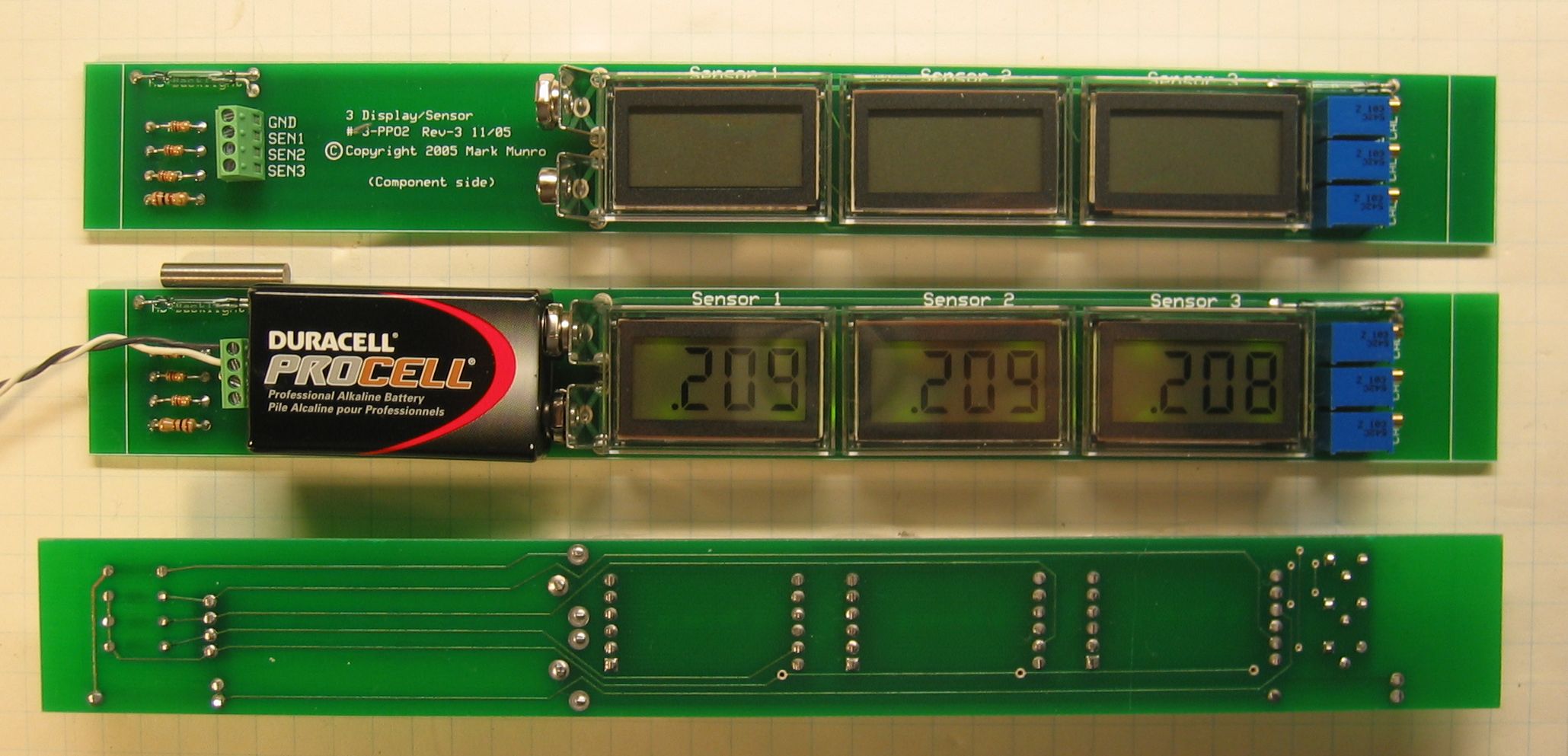 The three displays run off a single 9V battery mounted on the back or a 9V - 14VDC external power source. Power is turned on by removing a magnet external to the housing which is left in place when not in use. The magnetic reed switch for power can be seen on the printed circuit board (PCB) in the upper left of the first photo below, to the left of the upper most display. Each display has back lighting which is activated by placing a magnet external to the housing close to the magnetic reed switch located on the PCB to the left of the lower display . The sensor calibration trim pots can be mounted on either side of the board and can use top or side mounted trim screws. Dimensions: 1-13/16 wide x 3-5/8" long x 1-3/16" deep with battery or 1/2" deep without battery. 4.5 cm wide x 9.3 cm long x 3 cm deep with battery or 1.3 cm deep without battery