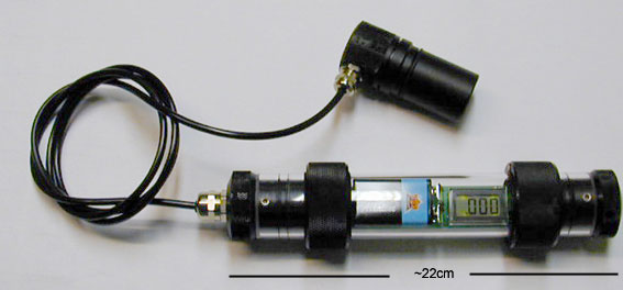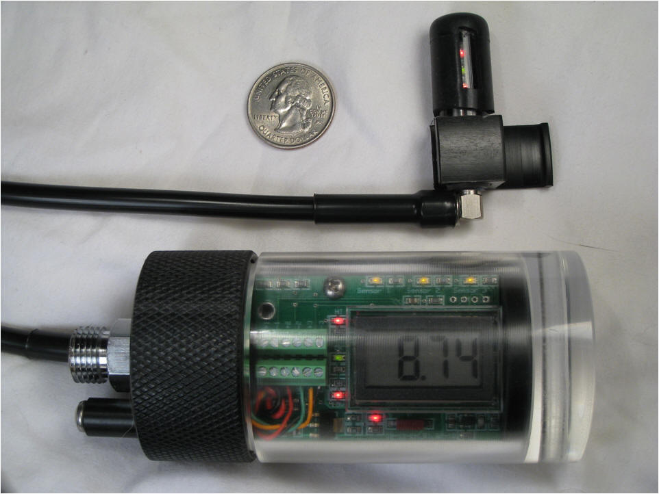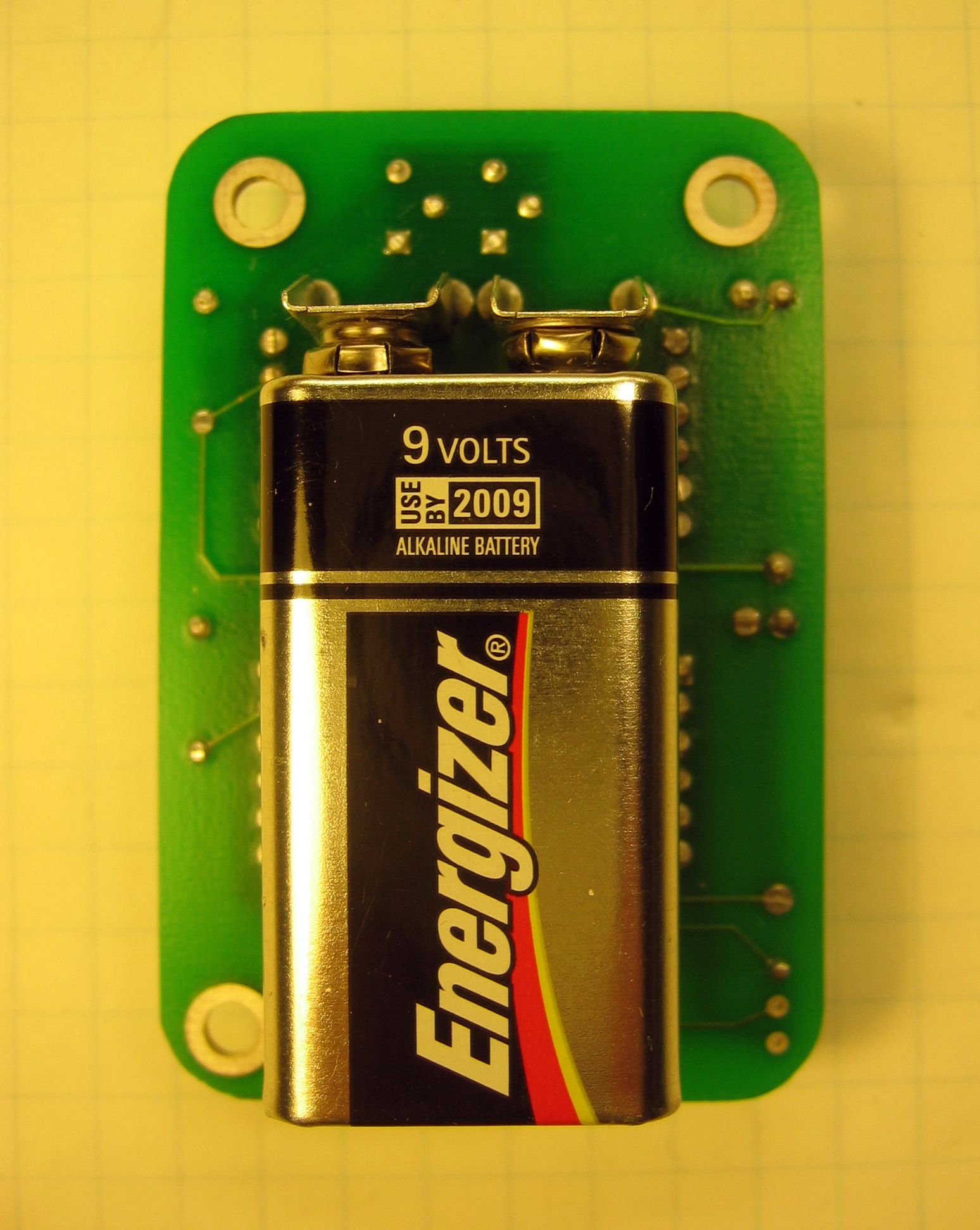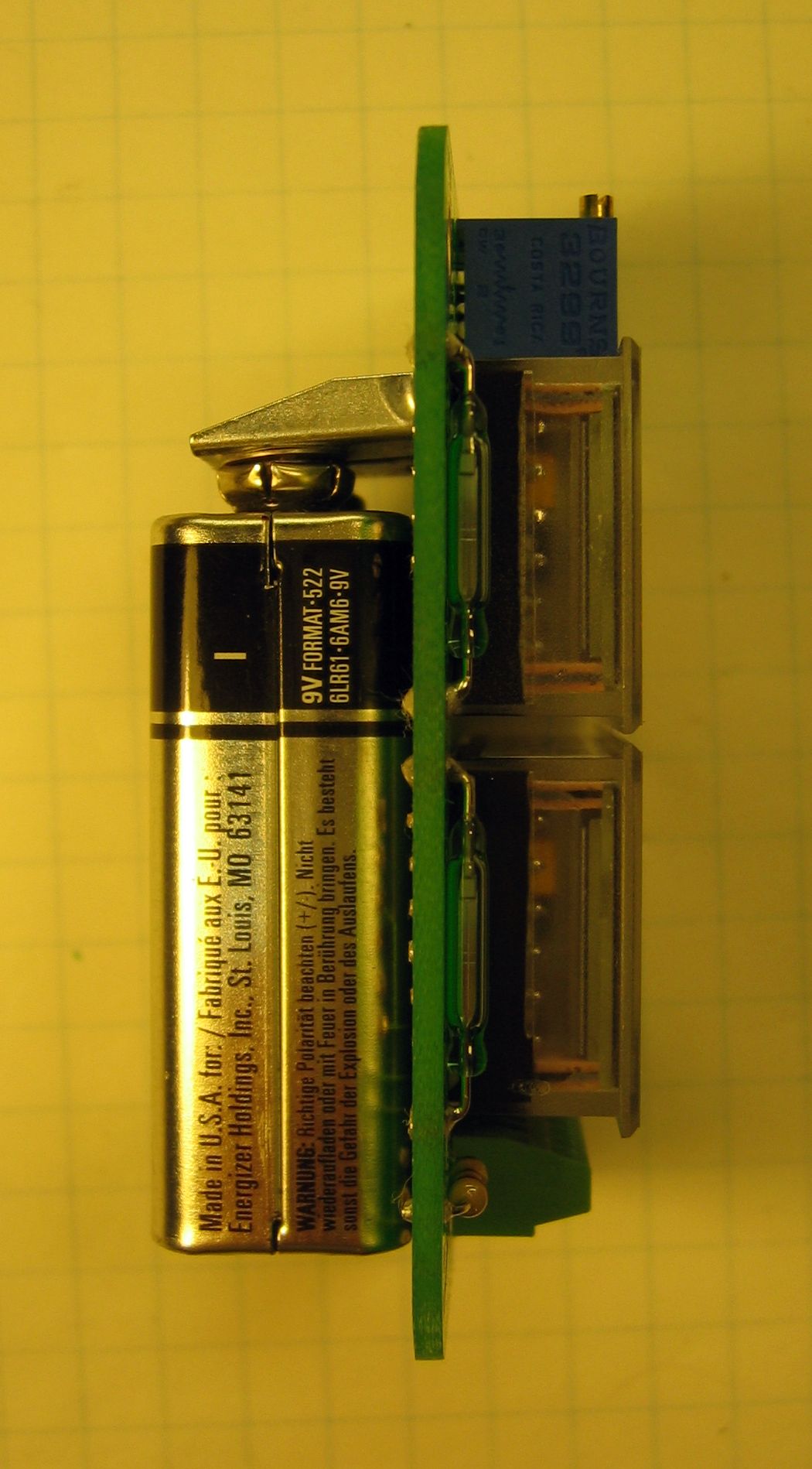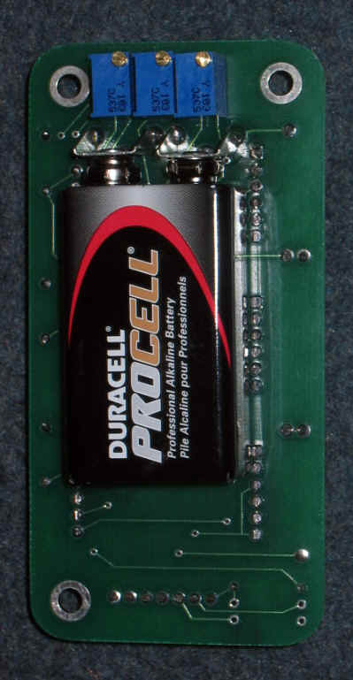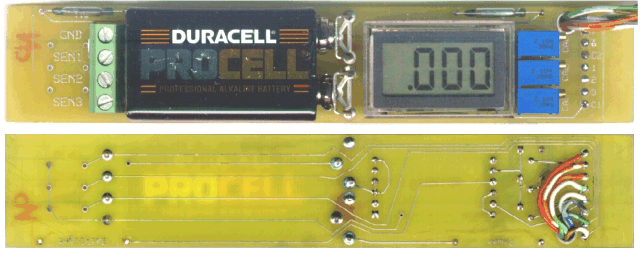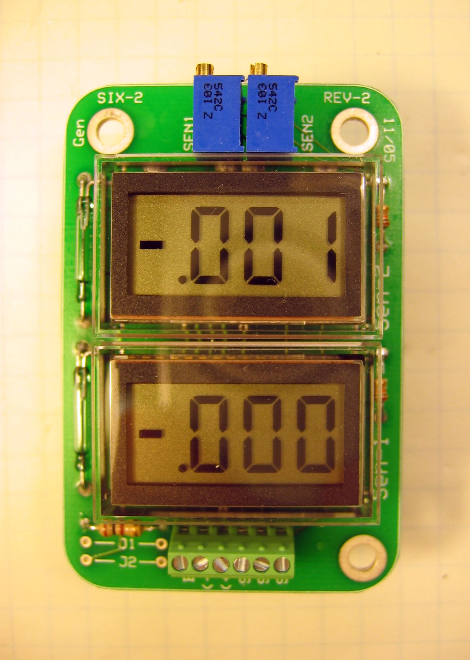 The two displays run off a single 9V battery mounted on the back or a 9V - 14VDC external power source. Power is turned on by removing a magnet external to the housing which is left in place when not in use. The magnetic reed switch for power can be seen on the printed circuit board (PCB) in the upper left of the first photo below, to the left of the upper most display. Each display has back lighting which is activated by placing a magnet external to the housing close to the magnetic reed switch located on the PCB to the left of the lower display . The sensor calibration trim pots can be mounted on either side of the board and can use top or side mounted trim screws. Dimensions: 1-13/16 wide x 2-3/4" long x 1-3/16" deep with battery or 1/2" deep without battery. 4.5 cm wide x 7 cm long x 3 cm deep with battery or 1.3 cm deep without battery (Click on the image for full size)