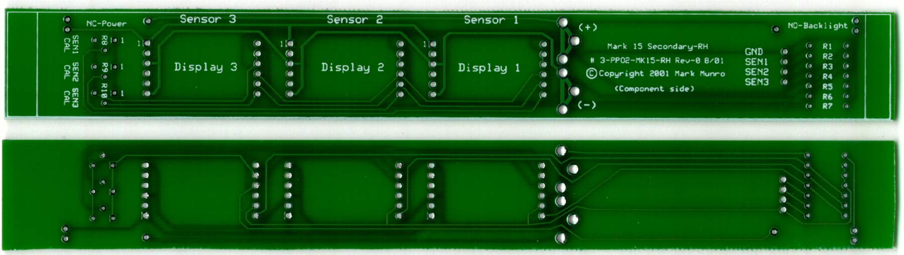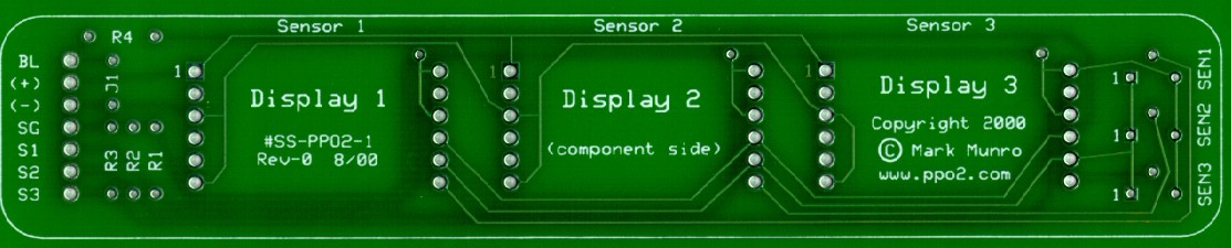 $25, Board #MK15-PPO2 Exactly like the #3-PPO2 board except it's a mirror image, meaning it's designed to come around your right side instead of your left. These boards are specifically made for the MK15/BMR500 so they can't be used for home builts unless you're designing around the MK15/BMR500 circuitry. (Click on the image for full size) Parts list Housings I don't sell housings for these boards but: Drawings of the end caps I use are here. Also Martin at Tec Me is selling end plugs, tubing, and complete housings at a reasonable cost. The links below are a must read if your interested in purchasing a board. Operating Principles, A description of the why and how of display board operation. How to Construct, A page with the instruction sheet on how to assemble a board. Construction Photo's, Photo's and descriptions of constructing a 3 display board. |